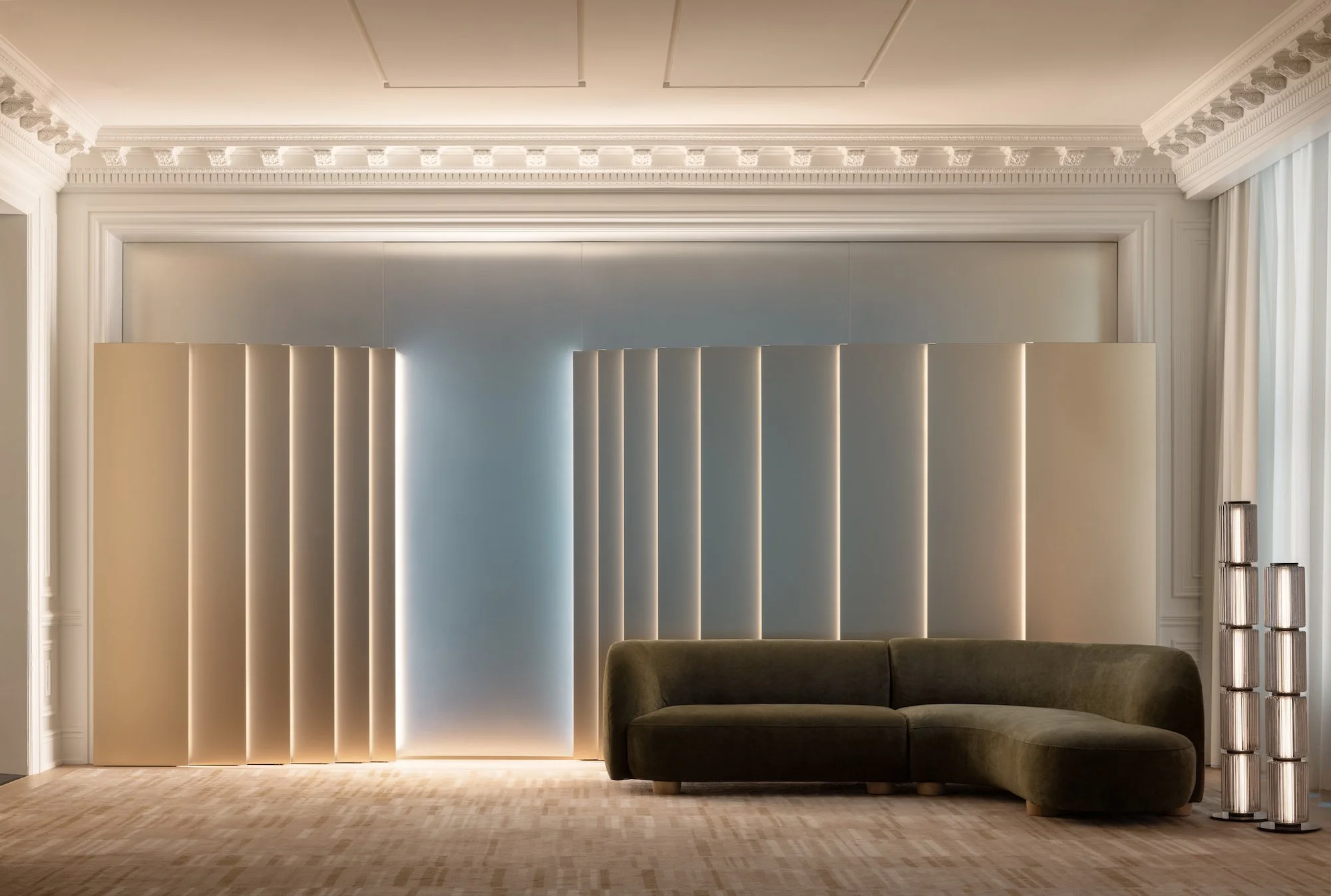 This pre-function area at The St. Regis Toronto, designed by Mason Studio and completed in 2025, features contrasting warm and cool light to draw the eye and indicate a point of gathering and pause for guests. Photo by Brandon Barre